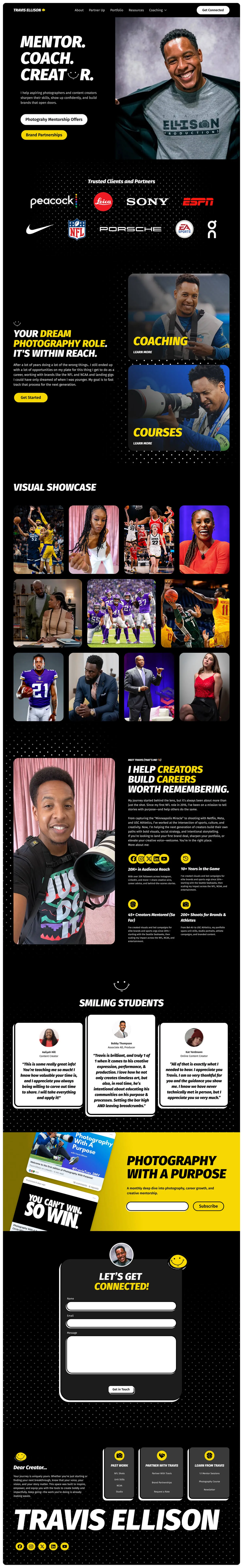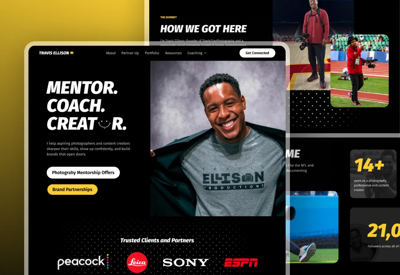 Travis Ellison is a sports and lifestyle photographer whose work has been featured by major brands, athletes, and media outlets — but his website wasn’t keeping pace with his growing business. Visually, it felt dated and inconsistent with the high-caliber, visual-first brand he’d built on social media. Navigation was clunky, making it hard for potential clients to find his best work or understand his services. The back end was just as frustrating: updates required too many tools, limiting his creative control and making it slow to publish new projects, offers, or case studies. His goal was clear: modernize the site so it matched the energy, professionalism, and growth of his brand while turning it into a sales tool for both his photography and new educational ventures.
